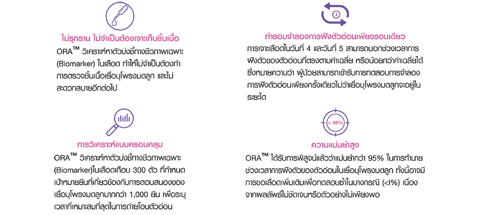 ORA™ คือ วิธีการตรวจที่ทันสมัย ซึ่งออกแบบมาเพื่อประเมินความพร้อมของเยื่อบุโพรงมดลูก (เยื่อบุภายในมดลูก) ก่อนการฝังตัวอ่อน โดยไม่จำเป็นต้องเก็บชิ้นเนื้อจากเยื่อบุโพรงมดลูก หากแต่ใช้วิธีการเก็บตัวอย่างเลือด เพื่อนำไปวิเคราะห์หาตัวบ่งชี้ทางชีวภาพเฉพาะ (Biomarker) ที่เกี่ยวข้องกับการพัฒนาเยื่อบุโพรงมดลูกในระหว่างการฝังตัวอ่อนการทดสอบนี้จะช่วยให้แพทย์ผู้เชี่ยวชาญด้านการเจริญพันธุ์ สามารถประเมินช่วงเวลาที่เหมาะสมและแม่นยำมากยิ่งขึ้นเพื่อถ่ายโอนตัวอ่อน (Window of implantation, WOI) ส่งผลประโยชน์ให้เกิดโอกาสการฝังตัวอ่อนที่สูงขึ้นและความสำเร็จในการตั้งครรภ์ของผู้มีบุตรยากมากยิ่งขึ้น