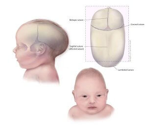 • ศีรษะยาวผิดปกติในแนวหน้าหลังคล้ายเรือ หรือ กะโหลกเป็นสันหว่างขม่อม (scaphocephaly จาก sagittal craniosynostosis)